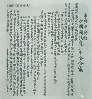 ▲為了推動第二次國共合作,中共中央在1937年2月10日致電國民黨五屆三中全會,提出五項要求和四項保證。