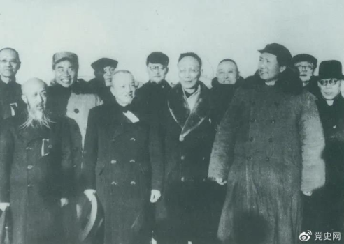 ▲1949年3月,各界人士代表在北京西苑機(jī)場同毛澤東、朱德等留影。