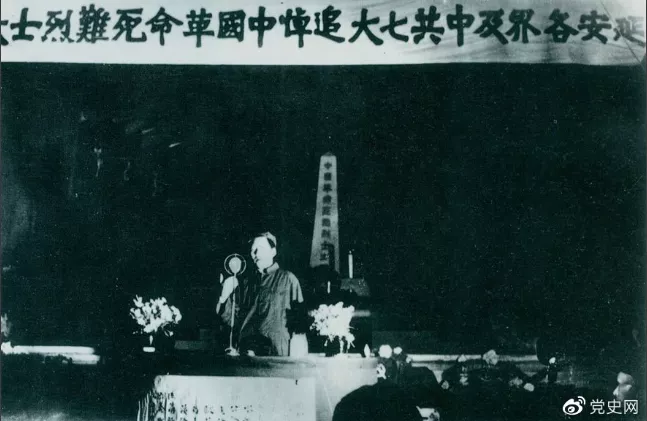 ▲1945年6月17日,中共七大代表及延安各界代表在中央黨校大禮堂,舉行中國革命死難烈士追悼大會。圖為毛澤東致悼詞。