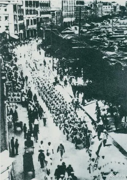 ▲從1925年6月19日起,香港和廣州租界的20萬(wàn)工人舉行罷工,聲援上海人民的反帝斗爭(zhēng)。23日,廣州和由香港回廣州的工人10萬(wàn)余人舉行大游行,在沙基慘遭英、法帝國(guó)主義的鎮(zhèn)壓。圖為當(dāng)時(shí)的游行隊(duì)伍。