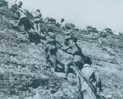 ▲1945年6月25日,八路軍冀中部隊(duì)攻克河北獻(xiàn)縣。圖為部隊(duì)奮勇攀登城墻。