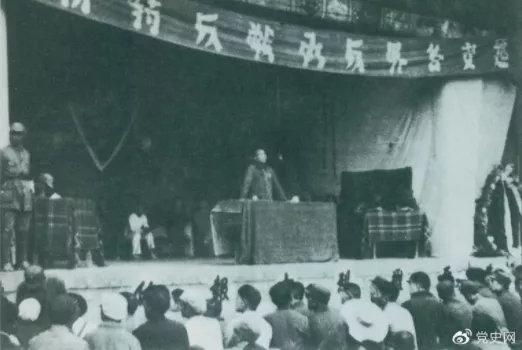 ▲1946年7月26日,朱德在延安各界反對內戰(zhàn)動員大會上發(fā)表講話,號召全國人民團結起來,打退國民黨軍對解放區(qū)的進攻。