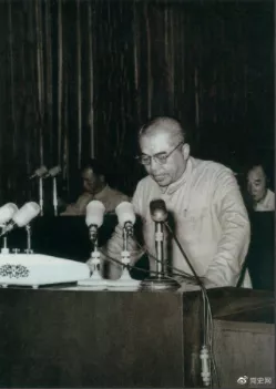 ▲1955年7月30日,一屆全國人大二次會議通過《中華人民共和國兵役法》。圖為國防部部長彭德懷在會上作報告。