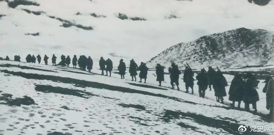 ▲1950年3月,人民解放軍開始向西藏進軍,10月6日至24日進行了昌都戰(zhàn)役,攻占昌都,打開了進軍西藏的大門,為和平解放西藏奠定了基礎(chǔ)。圖為迂回昌都南路的人民解放軍行進在海拔5000米的怒山山脈雪嶺上。