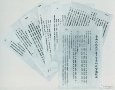 1949年12月2日,中央人民政府委員會第四次會議決議,每年10月1日為中華人民共和國國慶日。圖為中央人民政府委員會第四次會議記錄。