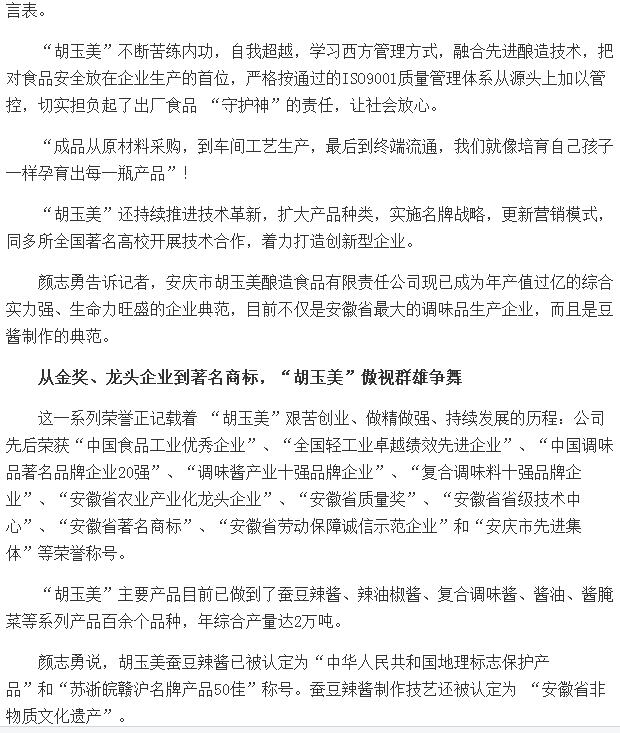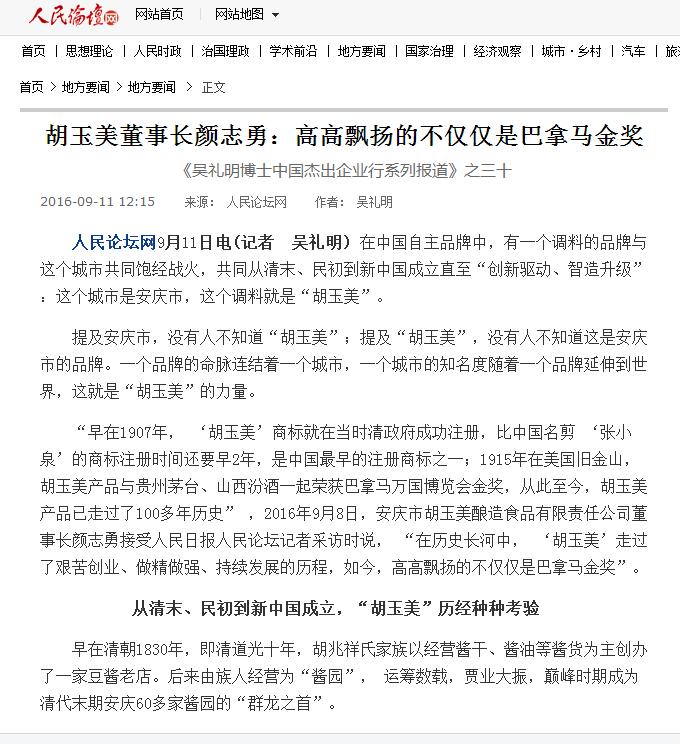 人民論壇網(wǎng)刊文報道——《胡玉美董事長顏志勇:高高飄揚的不僅僅是巴拿馬金獎》