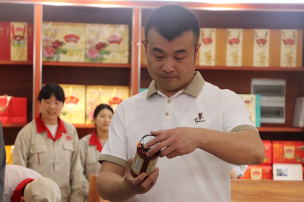 桐廬縣餐飲行業(yè)協(xié)會(huì)一行先后參觀了公司兩大曬場(chǎng)、辣油椒醬車間及胡玉美紅樓店。昝幼龍向協(xié)會(huì)一行介紹了胡玉美的發(fā)展歷史、非遺制作技藝、產(chǎn)品創(chuàng)新及車間智能化技術(shù)運(yùn)用,闡述了“炒、燒、蒸,提鮮上色來(lái)一勺蠶豆醬”的徽菜靈魂特色及讓菜品更加味美、更有風(fēng)味的使用方法。從傳統(tǒng)釀造工藝的延續(xù),到智能機(jī)械臂的進(jìn)步,凸顯了胡玉美在傳承非遺的基礎(chǔ)上,以科技賦能傳統(tǒng)產(chǎn)業(yè)的實(shí)踐成果。