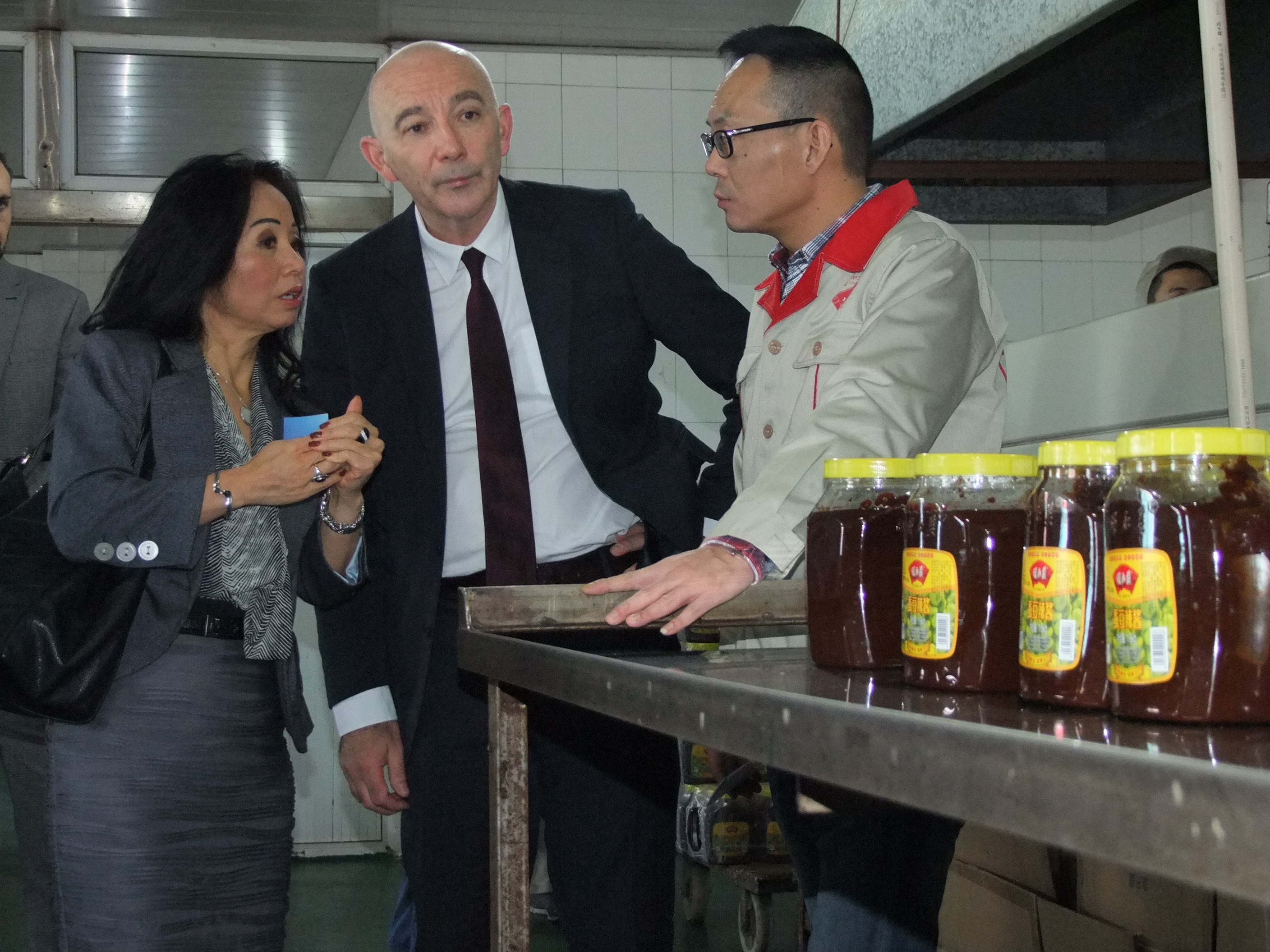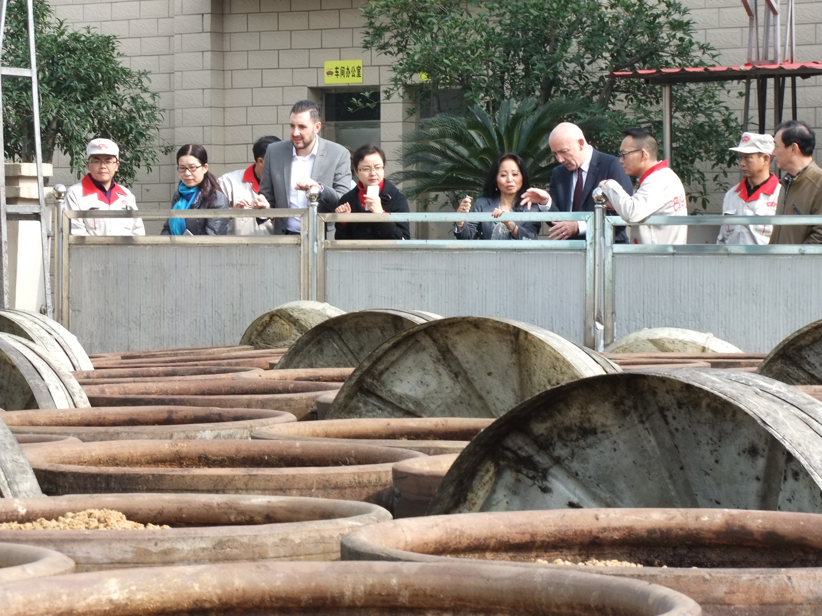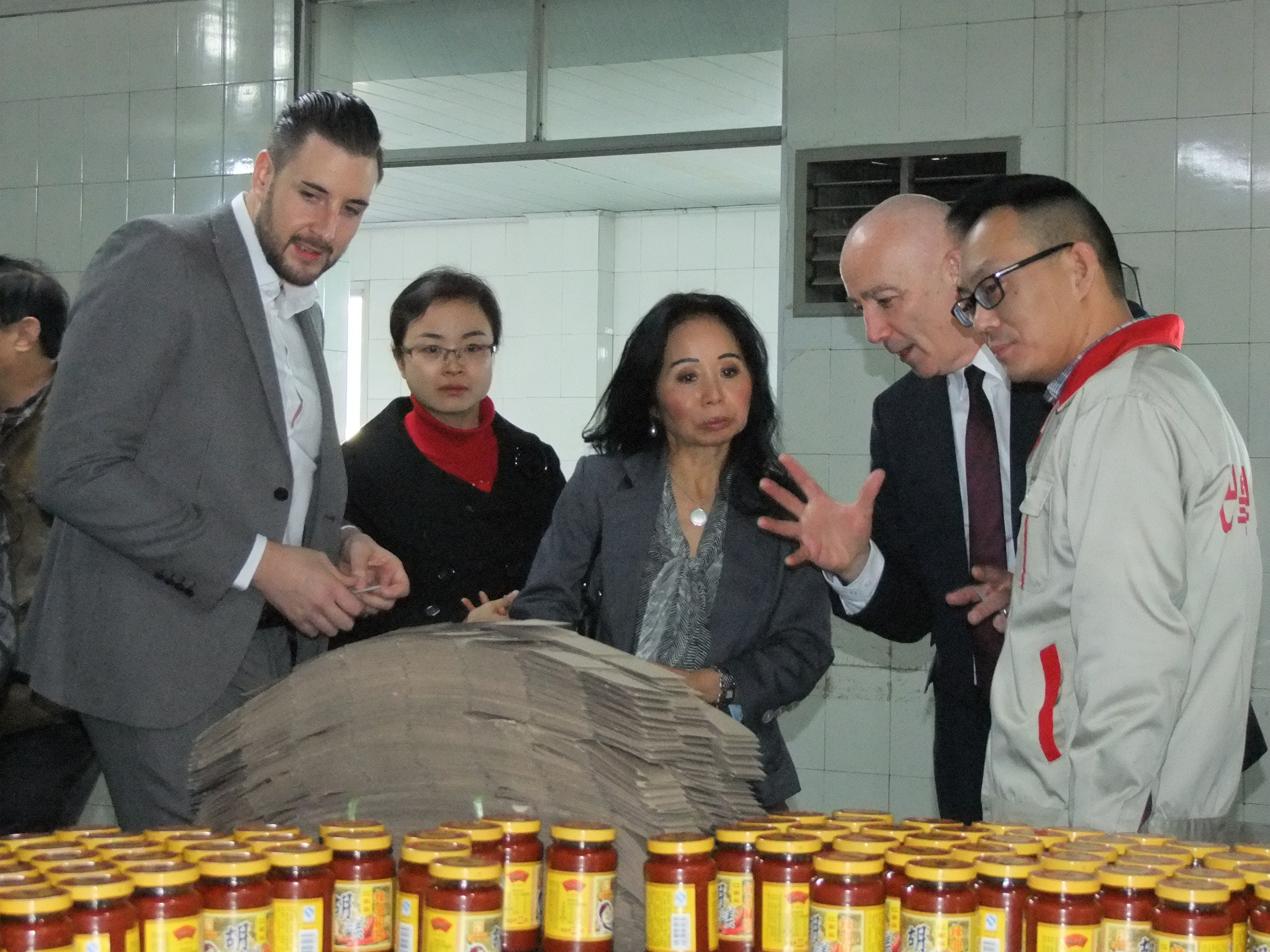 外商訪問團一行先后參觀了公司廠區(qū)、生產(chǎn)車間、大曬場等,顏志勇向訪問團一行介紹了我公司“拳頭”產(chǎn)品之一的蠶豆辣醬180天日曬夜露的傳統(tǒng)精華工藝。外商對胡玉美品牌至今186年的歷史產(chǎn)生濃厚興趣并贊嘆不已,每到之處在細心參觀后,也都會駐足詳細詢問,認真聆聽,不時豎起大拇指表示贊揚。