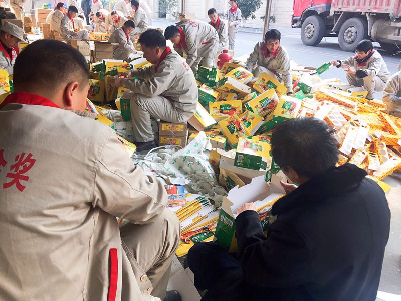 元旦期間,公司全體營銷人員放棄假期休息時間,為新年大單禮盒裝箱上車工作全力以赴。(辦 宣)