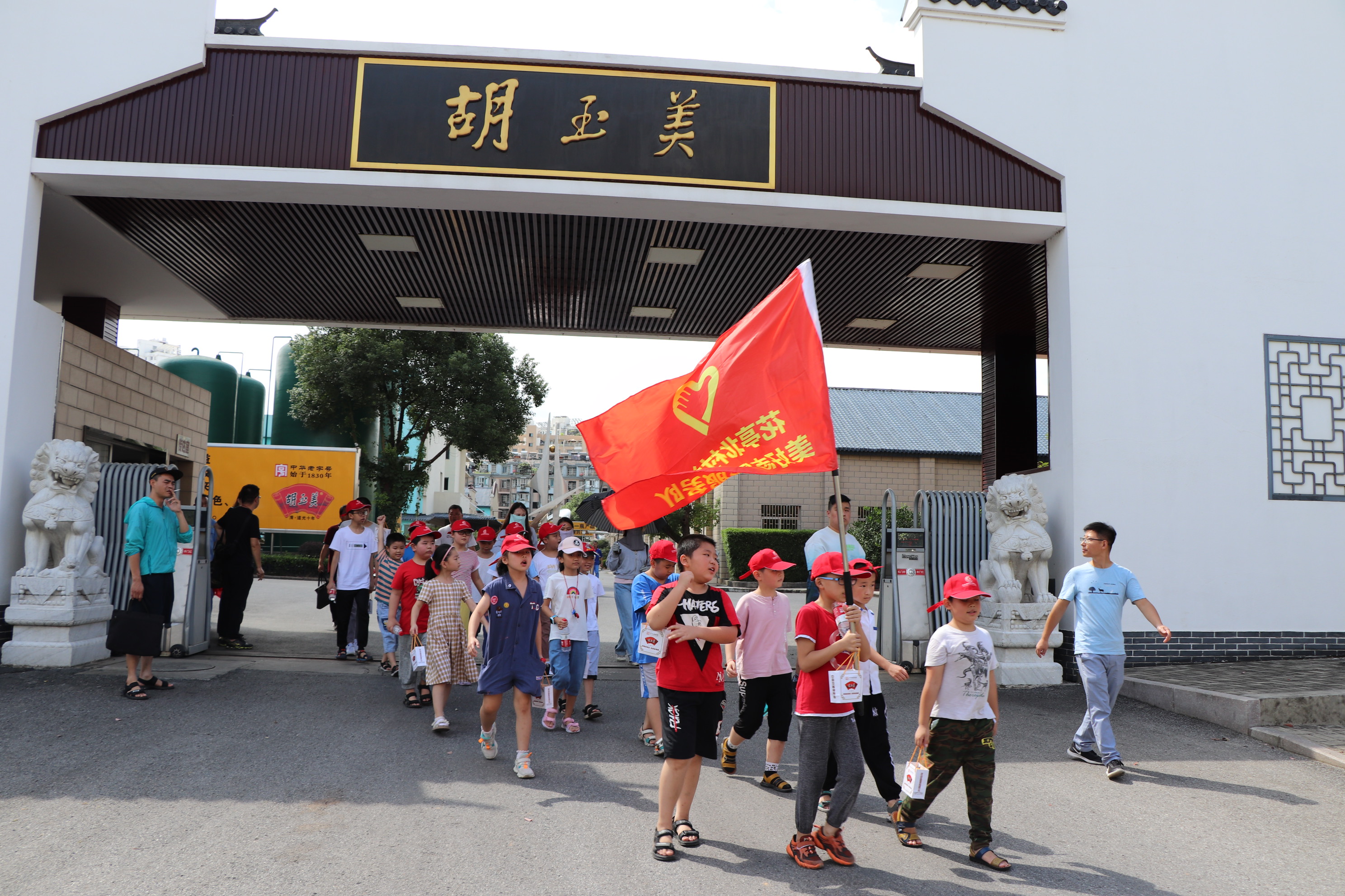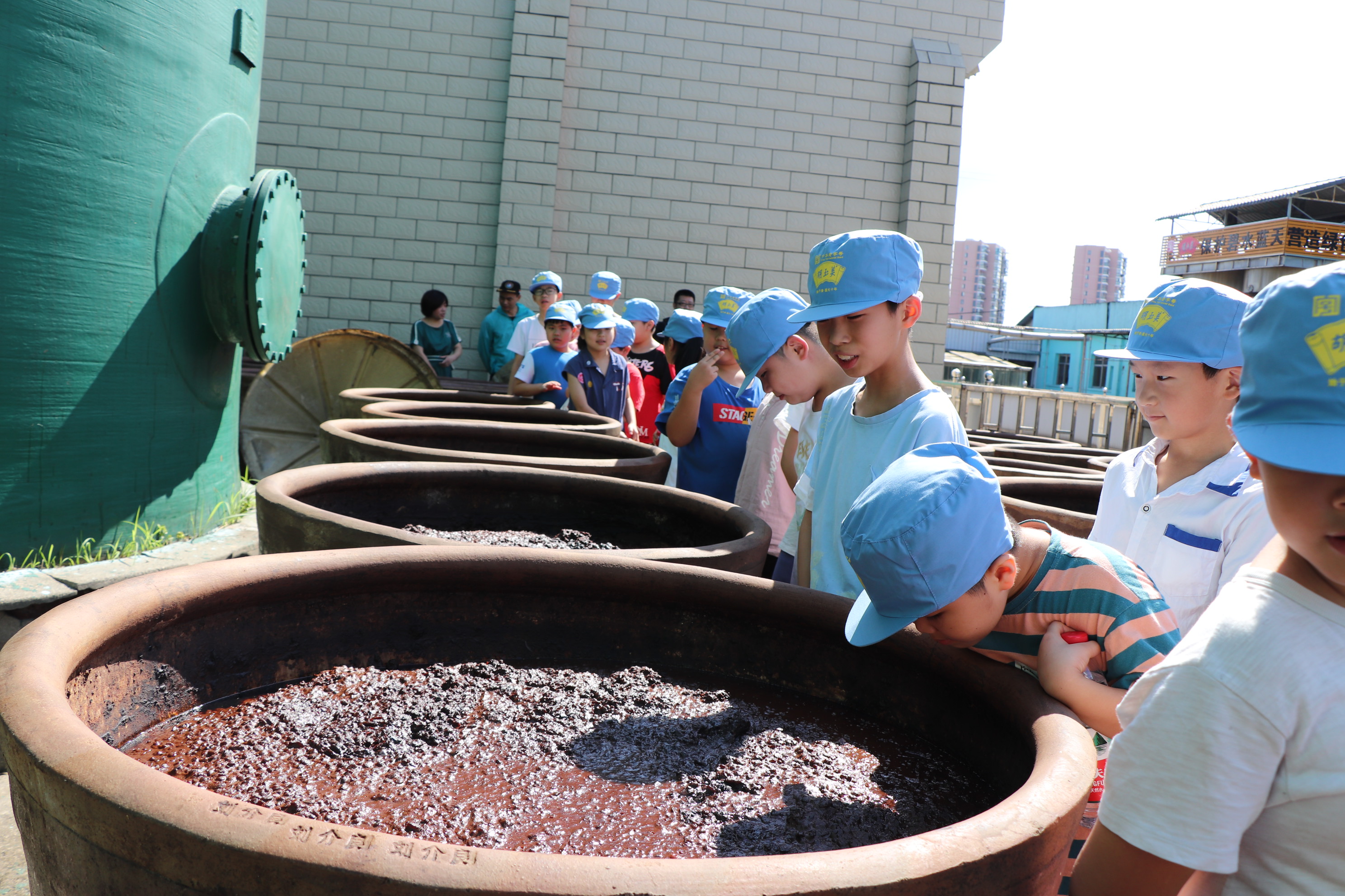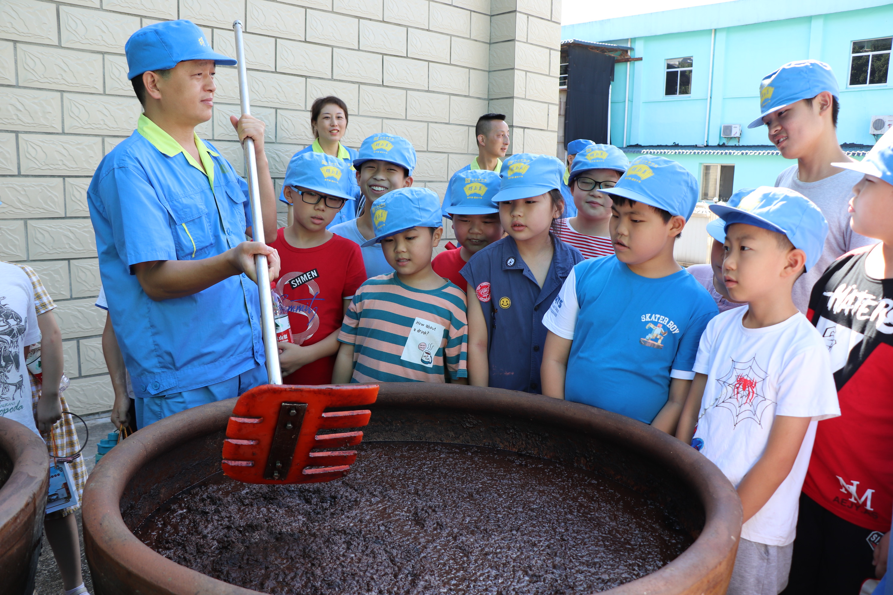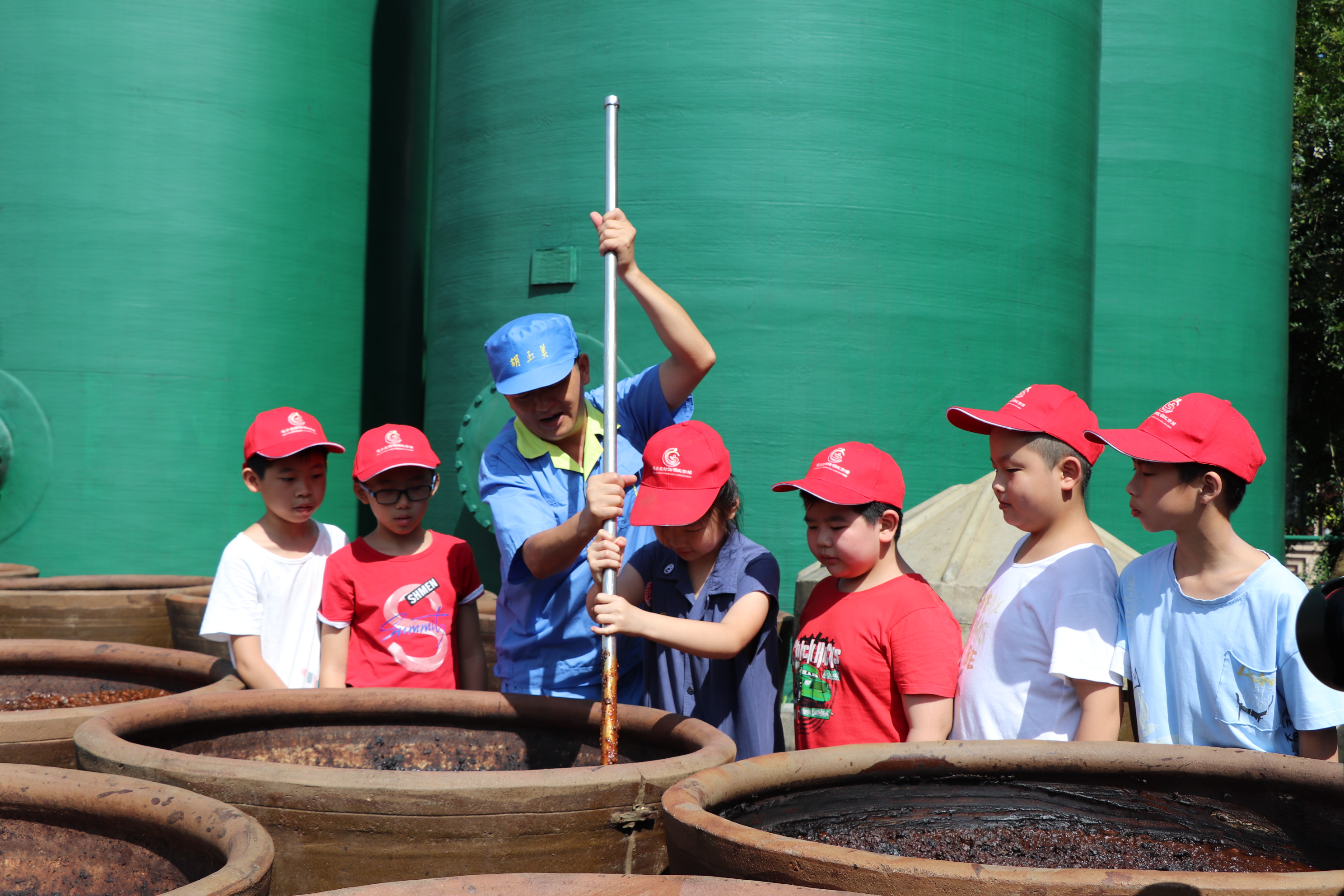 在公司二樓會議室,同學們觀看了胡玉美蠶豆辣醬非遺制作技藝宣傳片,詳細了解了胡玉美發(fā)展歷程,同時收獲了公司精心準備的胡玉美“醬”心禮。隨后,孩子們跟著公司工作人員興致勃勃地參觀起了非遺技藝操作現(xiàn)場。他們好奇地圍在缸前,聽著技術(shù)中心副主任悉心講解制醬知識,看他現(xiàn)場演示翻醬絕活?!胺u的時候首先要注意將耙子順著缸璧慢慢抵到缸底,然后緩緩向上翻,一缸必須打滿18耙,才能釀出合格的醬?!焙⒆觽冘S躍欲試,親自動手翻醬、打耙,“零距離”感受古法制醬的魅力。陽光下,濃郁的醬香味隨風飄散開來,小朋友們興奮地說到“辣中帶著甜味”,更有小朋友直呼“想蘸著醬吃大餅”。活動接近尾聲時,當公司工作人員問起有關(guān)胡玉美的小問題,他們紛紛舉起了小手,都能準確回答上來。通過近一個半小時寓教于樂的活動,孩子們體會到非物質(zhì)文化遺產(chǎn)傳承的重要性,進一步領(lǐng)悟了精益求精的工匠精神。